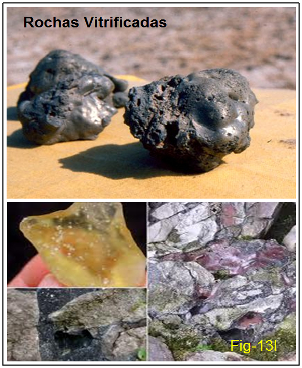 Figura 13I – Rochas vitrificadas – Este é outro achado que levou os pesquisadores a considerar explosão nuclear como modo de destruição de Mohenjo Daro. Isso se explica pelo fato de que uma rocha só se vitrifica quando é submetida a altas temperaturas, ficando em estado de plasticidade e, a seguir, ao esfriar, mostra-se com aparência de vidro.