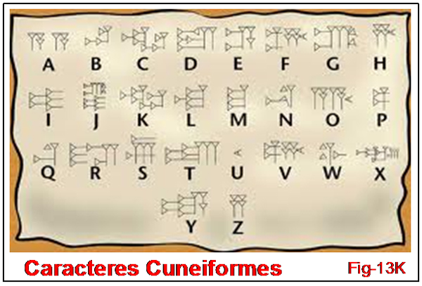 Símbolos de difícil interpretação que até agora não foram decifrados. Um franco contraste com o que aconteceu com os achados da Suméria. Nela foram encontradas milhares de tablitas inscritas em linguagem cuneiforme, um sistema semanto-fonético. Semanto-fonético significa símbolos representando fonemas, como nas linguagens atuais em que os caracteres alfabéticos e numéricos ao serem juntados formam palavras e frases, representando os sons da linguagem humana. Figura 13K.