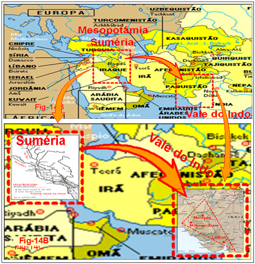 O pesquisador Zecharia Sitchin em alguns de seus livros tais como: Os Reinos Perdidos, A Escada Para o Céu, Começo do Tempo, O Livro Perdido de Enki e As Guerras dos Deuses e Homens, resultado que são das traduções que fez das tablitas sumérias, faz revelações sobre os povos a leste da Mesopotâmia citando o Vale do Indo. Figura 14B.