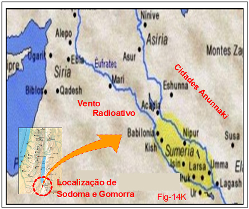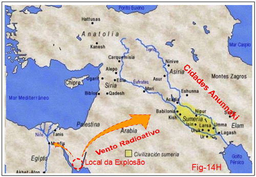 O vento radioativo espalhou-se por toda a península indo em direção à Mesopotâmia onde se situavam as principais cidades dos Anunnaki, figura 14H, provocando pânico geral, pois o inesperado evento para seus habitantes, não deu tempo de se protegerem ou fugirem.