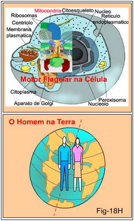 Com tanta especialização contida nessa complexidade, até nos sentimos encorajados a dizer que o Motor Flagelar Bacteriano é um ente situado no interior do universo celular, assim como, como ser humano, somos um ente no universo Terra. Figura 18H. Achamos que essa comparação não leva nenhum exagero.