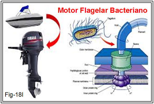 Na figura 18i vemo-lo em desenho mais simples e, metaforicamente, sendo comparado ao motor de popa de um barco. A maneira funcional de movimentação do Motor Flagelar, pois de fato se movimenta não só no giro do Filamento, mas também se desloca de um ponto a outro dentro da célula, planejadamente, e não aleatoriamente, se assemelha à propulsão que o motor de popa implementa ao barco.