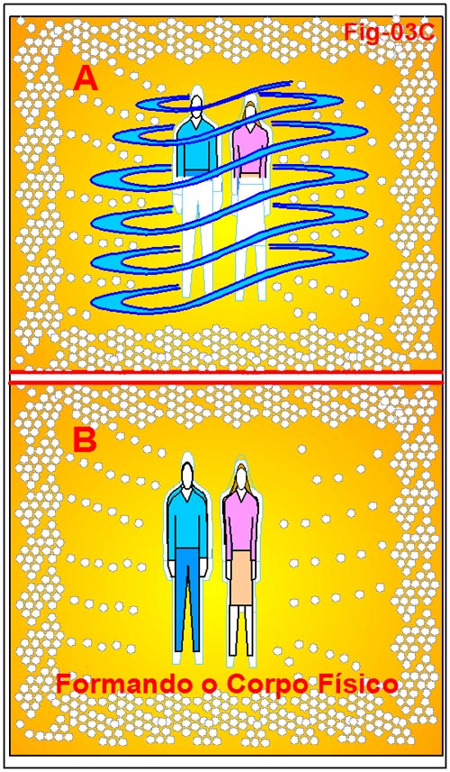 Nesta figura 03C, quadros A e B, representa-se a continuidade da aglutinação molecular e, por consequência, como mencionado, a manifestação do corpo físico.