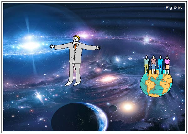 Todavia... incorrigível em seu orgulho, o homem, terrestre, considerando-se o produto de só uns seis mil anos, finca pé na crença de que o UNIVERSO foi criado só para ele. Sente-se o centro e tudo o mais ao seu redor. Figura 04A.