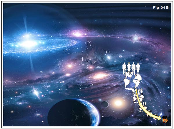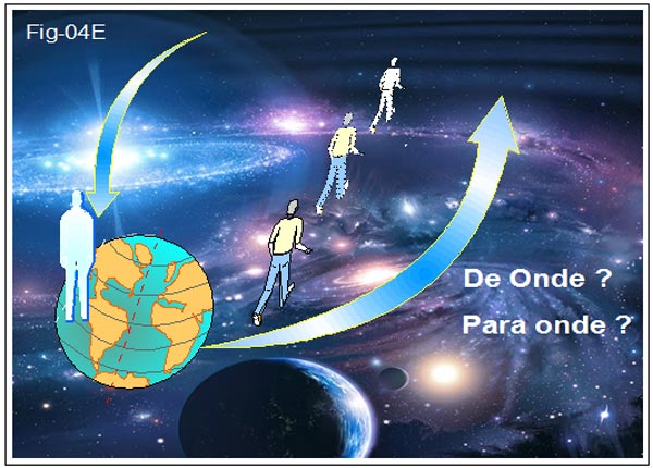 Sim, porque, se na figura 04E temos duas perguntas, “De Onde ?” e “Para onde ?”, correspondendo à perquirição sobre o originário ponto de surgimento do homem terrestre e sua consequente destinação, obviamente nossos olhares perscrutadores terão de ser lançados em direção às vastidões cósmicas.