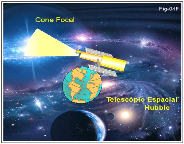Vejam na figura 04F a angulação do cone focal de visada do Hubble. Apesar, portanto, de toda a tecnologia de prospecção cósmica que atualmente possuem os observadores terrestres, ainda assim, existem muitos pontos não mapeados.