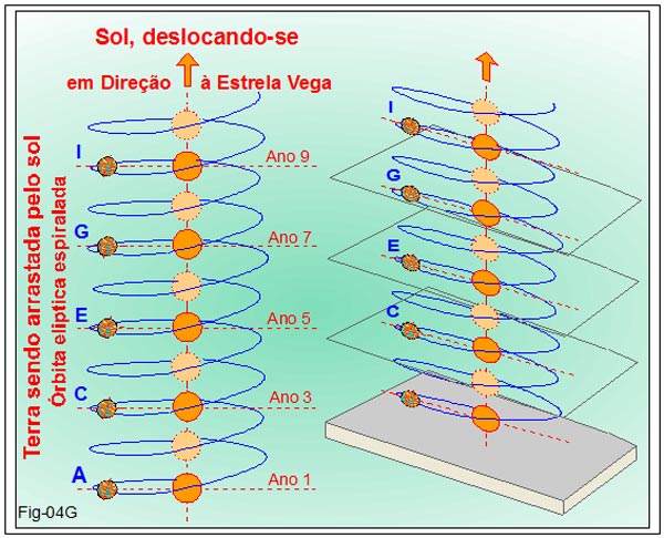 1 - A título de esclarecimento, complementando sobre o movimento orbital da Terra em torno do Sol, devemos informar que este movimento não se dá num plano fixo, permanente. A cada segundo de tempo ele se transfere a outro nível espacial da galáxia. Isso porque o Sol não se encontra estacionário. Ele se desloca em direção à estrela Vega, que é um movimento aparente. Ao faze-lo arrasta consigo os planetas do sistema. Todos, portanto, orbitam no sentido elíptico em torno do Sol, porém, descrevendo uma espiral “ascendente” que se estende no sentido do deslocamento que o sistema efetua no espaço galáctico. Figura 04G.