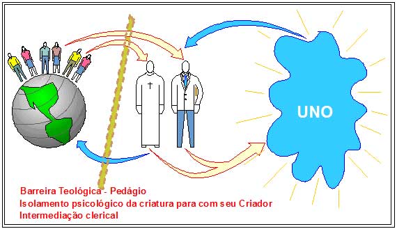 Inicio dizendo que, desde a mais tenra infância sentia aversão pelas obrigações de frequentar os templos católicos, embora que tenha sido esta a educação religiosa direcionada por meus pais. Apesar desta aversão, ao início de minha vida adulta tive participação em instituições protestantes que, então, embasaram, ainda mais, a aversão sentida por cerimonialismos e condicionamentos pastorais. Com a figura abaixo represento essa intermediação imposta ao povo pelas instituições religiosas, onde criaram barreiras psicológicas “separando” a criatura de seu Criador.