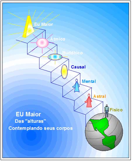 Daquelas alturas contempla seus estágios vivenciais desenvolvidos nos diferentes planos: Atmico – Buddhico – Causal – Mental – Astral – Físico – (Ver apostilas A Criatura).
