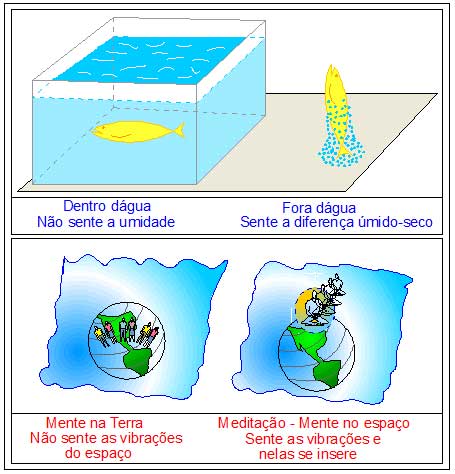 Mas também como os peixes que, embora dentro dágua, não sabem que estão molhados, pois sentir que se está umedecido só acontece quando se sai de dentro dágua, também nós não sentimos que estamos envoltos – “molhados” – pelas sublimes vibrações mentais.