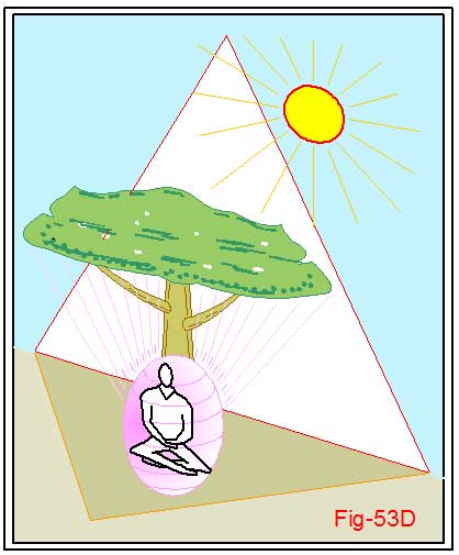 Deixe-se ficar dentro dela, da imagem visuali-zada, e sinta a quietude que ela lhe concede. Acomode-se. Veja na figura 53C o que ela sugere. Sente-se sob a frondosa árvore. Encoste e sinta o tronco a suas costas. Sinta, também, o contato com o chão. O “calor” inspirativo daquele Sol e a sombra amena da árvore. Sinta que só você está ali. Parecendo que o restante do universo desapareceu. Este profundo silêncio exterior vai lhe permitir ouvir sua voz interior. Não reprima a espontaneidade do que ela lhe falar. Pode, de início, lhe parecer dizeres desconexos. Sem fundamentos. Até mesmo, coisas bobas na sua conceituação. Deixe. Não preste muita atenção a isso. Apenas sinta. São seus sentidos ocultos se despertando. Olhos, ouvidos, e sentidos do tato, formas extras que você nem sabia possuí-los. Eles lhes trazem percepções novas. Percepções que vêm das outras dimensões de você mesmo.