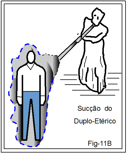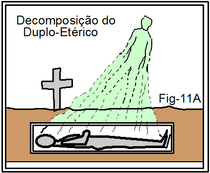 O que se vê, porém, é o duplo-etérico do recém desencarnado, e não o seu corpo Astral. Logo após a soltura inicia-se nele o processo de desintegração, tal como a decomposição do corpo humano. A figura 11A dá uma pálida idéia desse processo de desintegração do duplo-etérico. A desintegração total se completa em mais ou menos três dias após a morte. Em razão desse fato mentores espirituais orientam que a cremação de cadáver deve ser feita após um período maior que as costumeiras 24 horas depois da morte. O motivo dessa recomendação se prende ao fato de que dentro desse período de apenas 24 horas o duplo-etérico, ainda parcialmente composto, por sua função associativa, estará transmitindo à consciência, via corpo Astral, as desagradáveis impressões do corpo Físico sendo queimado.