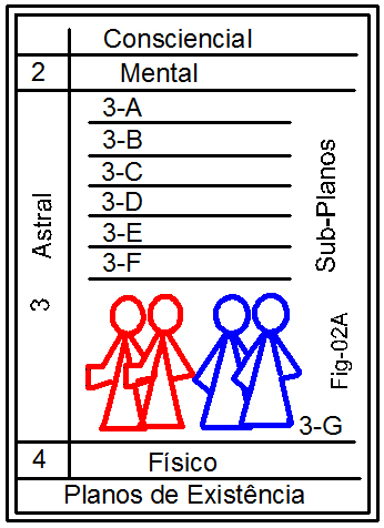 Observem a figura 02A. Nela, de forma simplificada, representamos a divisão dos planos existenciais. O plano Astral, que é o mais “próximo”, vibracionalmente falando, da crosta terrestre, o desenhamos com seus sub-planos para descrever uma importante informação. Neste plano, em seu sub-plano mais ao nível da crosta planetária, (sub-plano 3-G), na maioria de sua população estão os espíritos emocionalmente atormentados. Considerando essa peculiaridade, os médiuns em sua fase inicial de desenvolvimento, comunicam-se mais facilmente com entidades dessa categoria, pois a característica dos fluidos do sub-plano 3-G é muito semelhante à dos fluidos do plano Físico.