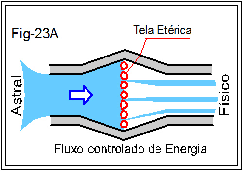 Dentro desses termos de comparação os chacras podem ser considerados como válvulas de fluxo variável. Ou seja, através deles o fluxo de energia que por ali se transfere do plano Astral ao plano físico, tem sua intensidade regulável e variável. Essa variação é controlada por um dispositivo situado no ponto de conexão entre o corpo Astral e o corpo Físico. Esse dispositivo tem o nome de Tela Etérica, conforme a designação que lhe é dada nos estudos esotéricos. Na figura a seguir 23-A fazemos uma representação desse dispositivo filtrante.