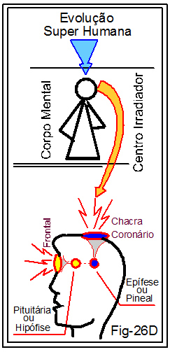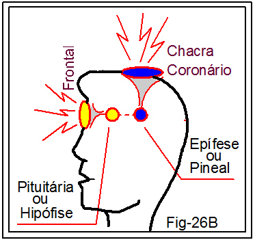 O que dizíamos da figura 26B, acima e à esquerda nesta folha, é que ela retrata o centro Captador de energia e diretor do corpo humano, e as informações citadas confirmaram. Desta forma, compreendemos que os chacras Coronário e Frontal concentram na glândula pineal as radiações captadas por eles. O Frontal, centrado na glândula pituitária, após esta, transfere as energias à glândula pineal. Elucidando essa informação, segundo André Luiz, autor espiritual, através do trabalho de psicografia do inesquecível Francisco Cândido Xavier, expressado no livro Evolução em Dois Mundos, páginas 66 e 67, diz ele que é dessa junção entre as duas glândulas que se formam os recursos da diversidade mental do indivíduo, proporcionando, além das já conhecidas, também a função mediúnica entre as duas dimensões da existência.