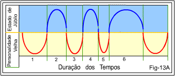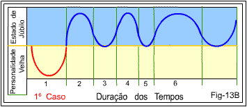 Na figura 13A vemos o traçado sinuoso da oscilação temperamental, onde fica clara a variação dos espaços de tempo em que perduram os dois estados emocionais. A figura, então, mostra que os espaços de tempo não são padronizados e nem uniformes, tanto nos estados de júbilo quanto na retomada dos comportamentos da personalidade velha.