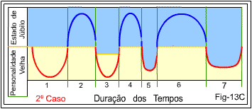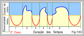 A figura 13C demonstra a situação descrita acima. Vemos que as energias de júbilo passam a ocupar algum espaço emocional nas fases de tendências da personalidade velha. (Tempos 3, 5 e 7). Isso faz com que a pessoa se sinta neutralizada em seus comportamentos menos coerentes com o Despertar.