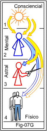 Na figura, o audacioso corpo Astral, “desobedecendo” ao comando central, “corta” o fluxo descendente. Devido a isso, o comando do Espírito, representado pelo fluxo de energia, se torna imperceptível ao corpo Humano. Este, por sua vez, com sua respectiva independência, não percebendo o alerta que vinha do “alto”, e mancomunado com o corpo Astral, continua seus procedimentos inconvenientes.