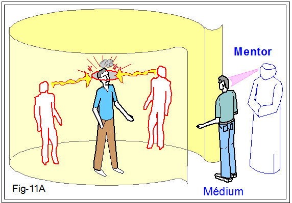 A figura 11C ilustra o atendimento para os casos complexos. Nela vemos dois médiuns em sintonia com o mentor espiritual, criando uma faixa magnética de vibrações protetoras. Esta faixa envolve todos eles, incluindo o paciente. Seu efeito é o de impedir a aproximação dos obsessores, repelindo, também, suas radiações deletérias.