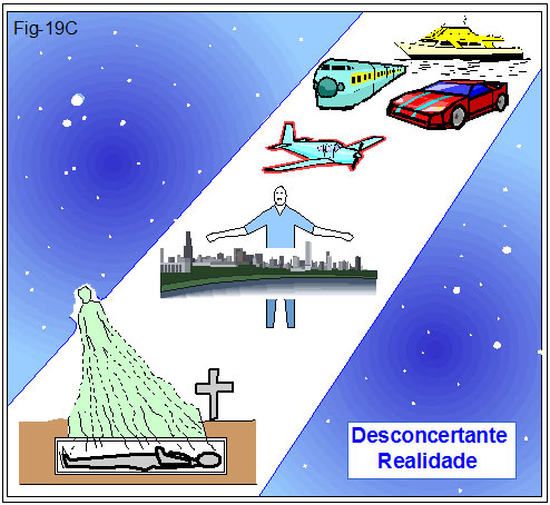 Para trás ficaram os marcos de um tempo em que seus olhos enxergavam apenas a materialidade. Figura 19C. Depois, percebendo toda essa inconsistência, distingue que um só, e inevitável, destino existe. Seus olhos, então se voltam para o infinito. A grande viagem de volta à “Casa Paterna” é a promessa da libertação.