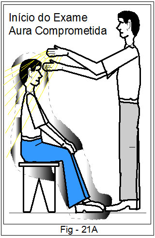 Através da sensibilidade de suas mãos, figura 21A, o médium terapeuta, percorrendo os limites da aura do paciente, comprova que aquela psicosfera está em efervescente turbulência.