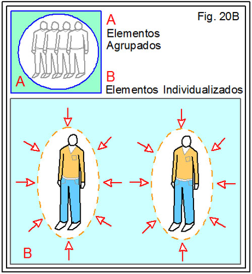 No quadro “B” aparecem os indivíduos, agora, “separados” uns dos outros. Ao redor de cada um, forças aglutinantes formam um campo gravitacional, respectivo e exclusivo.