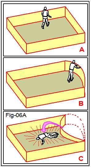 Entretanto, como a cerca é feita de material elástico – quadro A – figura 06A, isso significa que ao se fazer pressão – quadro B - numa direção, ao menor descuido a elasticidade do material pressionará a cerca de volta para a posição anterior, - quadro C – arremes-sando o intentador ao chão.