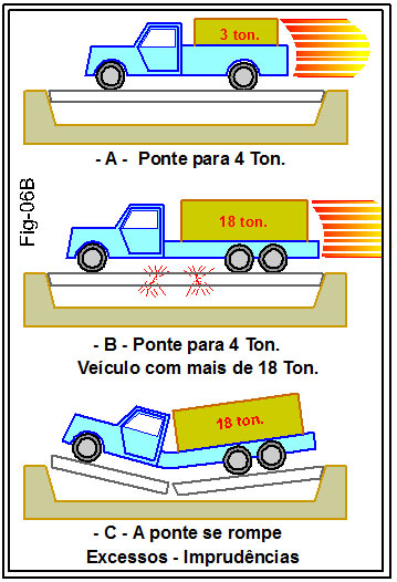 A figura 06B – aqui em tamanho pequeno – e maior na folha 2 – demonstra o que seja limite de tolerância. No quadro A vemos um veículo transportando carga de 3 toneladas, e transitando por uma ponte cuja capacidade de resistência é de 4 toneladas.