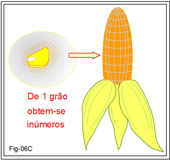 Assim que na Lei das Multiplicações nos exemplifica o poder gerador contido nas formas físicas. Por exemplo: semeamos, ou plantamos, UM GRÃO de milho, (figura 06C), e colhemos, desse mesmo grão, três ou quatro espigas, contendo, no total, CENTENAS de grãos iguais.
