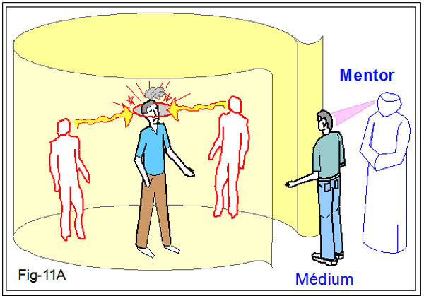 Do lado de fora desse campo, e prestes a nele entrar, vemos o médium acoplado ao seu Mentor espiritual. O Guia protetor.